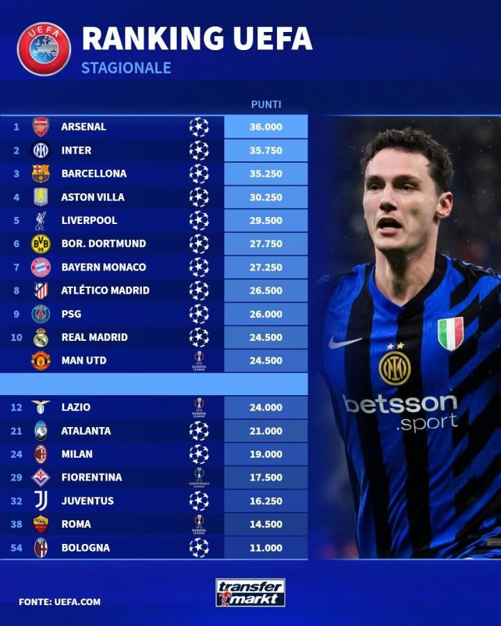 利物浦、多特蒙德、拜仁慕尼黑等豪门球队也在前十名中占据一席之地,展现了他们在欧战中的竞争力。与此同时,曼联作为唯一一支非欧冠球队,也表现出色,以24.500分排名第十,展现出了他们的竞技实力。